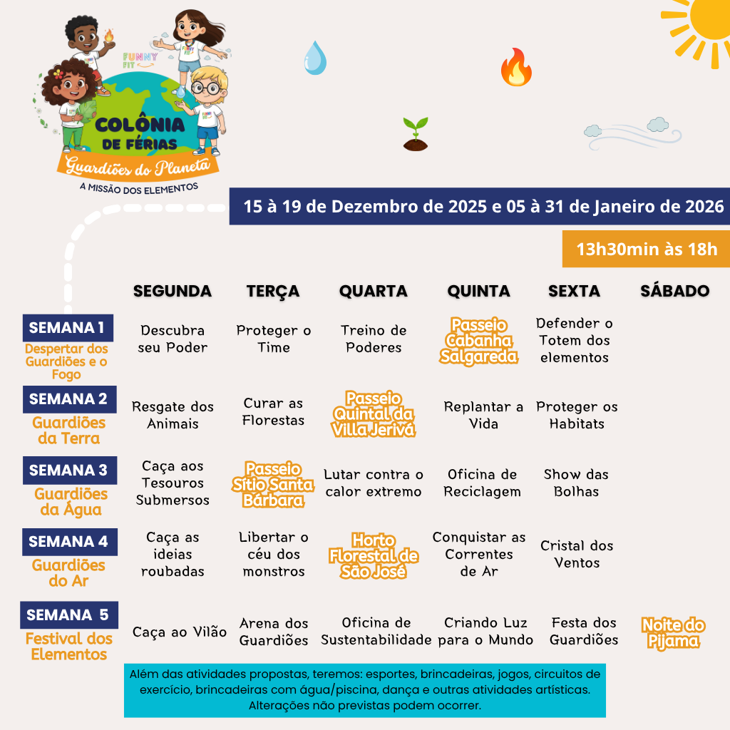 Nessa edição teremos quatro passeios e eles serão incríveis. Além dos passeios, teremos nosso grande encerramento da Colônia com a Noite do Pijama do dia 31/01/2026 para o dia 01/02/2026.
